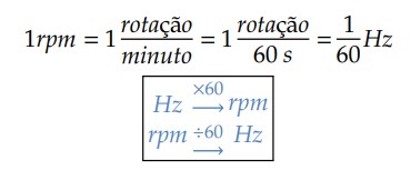 Apesar da unidade de frequência ser hertz (𝐻𝑧), é comum aparecer a unidade rotações por minuto (𝑟𝑝𝑚). A relação entre as unidades é dada por: