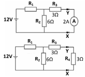 Na Figura 1 tem-se um circuito elétrico com resistores ôhmicos montado com um amperímetro ideal A, colocado em contato entre os pontos X e Y, que indica uma corrente elétrica de intensidade igual a 2 A. Além disso, no circuito tem-se uma fonte ideal, que alimenta o circuito com 12 V; uma resistência R₁; uma resistência R₂ de 6 Ω e uma resistência R₃ de 3 Ω. Na Figura 2, mostra-se quando o amperímetro é substituído por um resistor ôhmico R₄ com valor de resistência igual a 3 Ω. Neste último caso, qual o valor da tensão, em volts, sobre o resistor R₄.