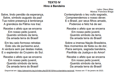 Marque a alternativa que possui o significado correto das palavras do hino apresentado no Texto IV.