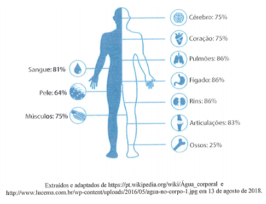 Nosso corpo possui uma fração significante de água. Cerca de 75% do cérebro, do coração e dos músculos e por ela constituído. O sangue, por sua vez, contém 81% de água; a gordura corporal, 14%; e o tecido Ósseo, 25%. O corpo humano adulto possui 65% de água em homens e 50% em mulheres. A figura abaixo ilustra algumas outras porcentagens de água que constitui o nosso corpo.