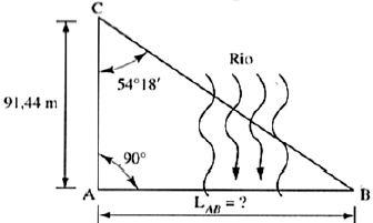 Um Agrimensor necessita determinar a distância entre A e B, mostrada na seguinte figura, sem equipamento eletrônico para medir distâncias. Devido a isto, o Profissional marcou no terreno um ângulo de 90° no ponto A e determinou o ponto C a 91,44m sobre a perpendicular marcada desde A, a montante do rio. Finalmente, mediu o ângulo no ponto C, encontrando-se o valor de 54°18’. O valor aproximado da distância AB é ( Dados: Tg 54º18’ aproximadamente = 1,39)