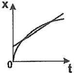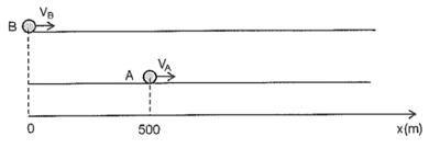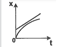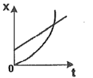A figura acima mostra duas partículas A e B se movendo em pistas retas e paralelas, no sentido positivo do eixo x. A partícula A se move com velocidade constante de módulo va=8,0m/s. No instante em que A passa pela posição x=500m, a partícula B passa pela origem, x=0, com velocidade de Vʙ = 45m/s e uma desaceleração constante cujo módulo é 1,5m/s². Qual dos gráficos abaixo pode representar as posições das partículas A e B em função do tempo?