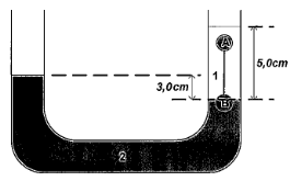Na figura acima, tem-se a representação de um tubo em “U" que contém dois líquidos imiscíveis, 1 e 2. A densidade do líquido menos denso é d. A figura também exibe duas esferas maciças, A e B, de mesmo volume, que estão ligadas por um fio ideal tensionado. A esfera A está totalmente imersa no líquido 1 e a esfera B tem 3/4 de seu volume imerso no líquido 2. Sabendo que as esferas estão em equilíbrio estático e que a esfera A tem densidade 2d/3, qual a densidade da esfera B?
