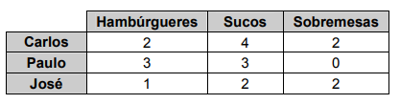 O quadro a seguir mostra a quantidade de cada um dos itens dos Combos que Carlos, Paulo e José consumiram: