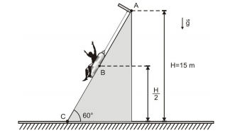 Essa “partícula” inicia seu movimento do repouso, no ponto A, situado a uma altura H = 15 m, escorregando ao longo do toboágua que está inclinado de 60o em relação ao solo, plano e horizontal. Considere a aceleração da gravidade constante e igual a g e despreze as resistências do ar, do toboágua e os efeitos hidrodinâmicos sobre a partícula. Para freá-la, fazendo-a chegar ao ponto C com velocidade nula, um elástico inicialmente não deformado, que se comporta como uma mola ideal, foi acoplado ligando essa partícula ao topo do toboágua.