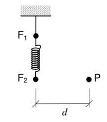 Como mostra a figura acima, a fonte sonora F₁ está presa ao teto por uma haste vertical. Outra fonte sonora F₂ está pendurada, em equilíbrio, por uma mola ideal na fonte F₁. As duas fontes emitem sons de mesma frequência f e em mesma fase. Se, em uma reta horizontal passando pela fonte F₂, a intensidade do som é máxima no ponto P (primeiro máximo de intensidade), situado a uma distância d de F₂, determine: