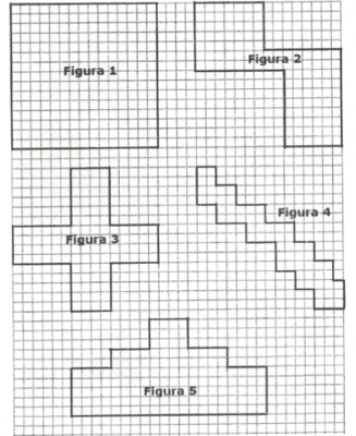 Considere a malha quadriculada abaixo composta de quadrados idênticos. Sobre as figuras numeradas de 1 a 5 criadas sobre essa malha, podemos afirmar que: