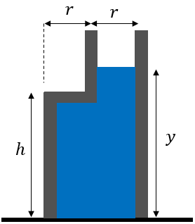 Considere o vaso com o formato abaixo, aberto na parte de baixo. Coloca-se água de densidade ρ no interior do vaso até uma altura y. Qual deve ser o valor de y para que o vaso esteja na iminência de perder o contato com solo? A massa do vaso vale m e a gravidade no local vale G. A pressão atmosférica local vale Patm.