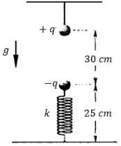 Duas esferas de pesos iguais a 120 N se encontram em equilíbrio, conforme figura abaixo. as duas esferas possuem cargas iguais a 40 𝜇𝐶, mas de sinais contrários. Dessa forma, podemos dizer que o comprimento natural da mola é de: