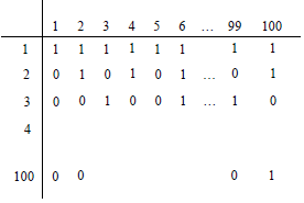 Esmeralda, a digitadora, construiu uma tabela com 100 linhas e 100 colunas, preenchendo uma casa com 1, se o número da linha da casa divide o número da coluna e com 0, caso contrário. Assim, por exemplo, a casa da linha 2 e da coluna 4 foi preenchida com 1, porque 2 divide 4 e a casa na linha 3 e da coluna 7 foi preenchida com 0.