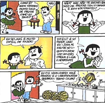 Na fala do segundo quadrinho, é possível perceber o quanto o suco de frutas é benéfico à saúde somente das crianças.