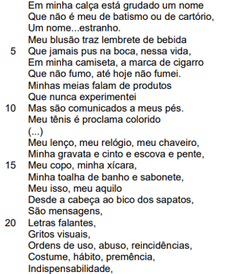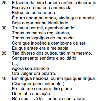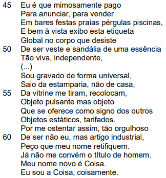 II - O uso da “etiqueta” pelo eu lírico (verso 48) sugere a dependência do homem a padrões estéticos ditados pela moda e pelo mercado.