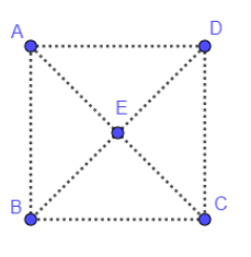A figura abaixo apresenta um quadrado ABCD e um ponto E, pertencente às diagonais desse quadrado. Escolhendo-se aleatoriamente três pontos dentre os cinco possíveis e conectando-os através de segmentos de reta, qual a probabilidade de se formar um triângulo?