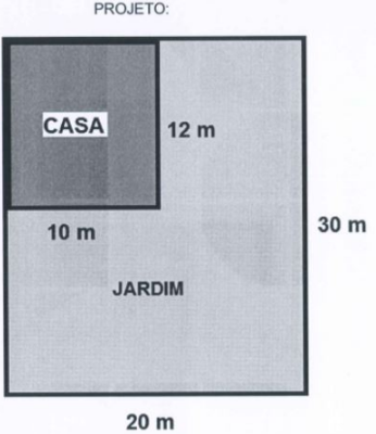Uma casa de formato retangular, com as medidas indicadas no projeto abaixo, foi construída em um terreno, também de formato retangular, com 20 metros de largura e 30 metros de comprimento.