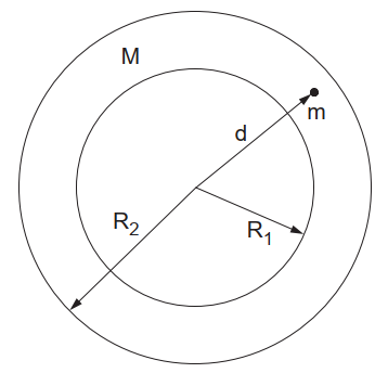 Uma casca esférica tem raio interno R₁ , raio externo R₂ e massa M distribuída uniformemente. Uma massa puntiforme m está localizada no interior dessa casca, a uma distância d de seu centro (R₁ < d < R₂). O módulo da força gravitacional entre as massas é