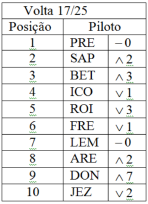 Em corridas de carros, é comum mostrar a posição dos pilotos em cada uma das voltas da corrida, relativamente à ordem de largada. Para isso, são usados os símbolos-0 para indicar que a posição é a mesma da largada, ^ ao lado de um número indicando quantas posições ele subiu em relação à largada e V ao lado de um número indicando quantas posições ele caiu em relação à largada. Além disso, utiliza-se uma abreviação dos nomes dos pilotos. Na volta 17 de uma corrida de 25 voltas, a posição dos dez primeiros colocados era a seguinte: