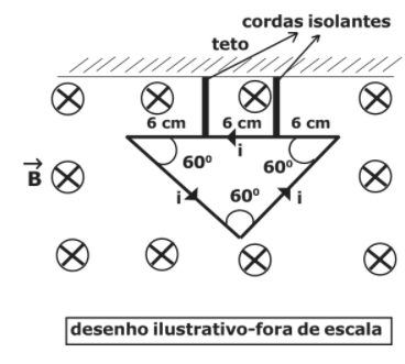 Em uma espira condutora triangular equilátera, rígida e homogênea, com lado medindo 18 cm e massa igual a 4,0 g, circula uma corrente elétrica i de 6,0 A, no sentido anti-horário. A espira está presa ao teto por duas cordas isolantes, ideais e de comprimentos iguais, de modo que todo conjunto fique em equilíbrio, num plano vertical. Na mesma região, existe um campo magnético uniforme de intensidade B=0,05 T que atravessa perpendicularmente o plano da espira, conforme indicado no desenho abaixo.
