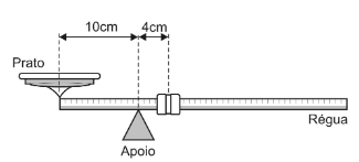 Em feiras livres ainda é comum encontrar balanças mecânicas, cujo funcionamento é baseado no equilíbrio de corpos extensos. Na figura a seguir tem-se a representação de uma dessas balanças, constituída basicamente de uma régua metálica homogênea de massa desprezível, um ponto de apoio, um prato fixo em uma extremidade da régua e um cursor que pode se movimentar desde o ponto de apoio até a outra extremidade da régua. A distância do centro do prato ao ponto de apoio é de 10 cm. O cursor tem massa igual a 0,5 kg. Quando o prato está vazio, a régua fica em equilíbrio na horizontal com o cursor a 4 cm do apoio.