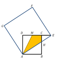 Na figura ao lado, 𝐴𝐸𝐹𝐺 e 𝐴𝐵𝐶𝐷 são quadrados e o ponto 𝐸 está na reta 𝐶𝐷. Além disso, M é o ponto médio do segmento 𝐶𝐷 e C é o ponto médio do segmento 𝑀𝐸. Sabendo que o quadrado 𝐴𝐵𝐶𝐷 possui lado 6, determine a razão entre as áreas do quadrilátero 𝐶𝐻𝐴𝑀 e do quadrado 𝐴𝐸𝐹𝐺.