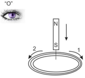 A lei de Lenz é útil para conhecer a direção da corrente elétrica induzida. O imã está caindo em queda livre. Para um observador O, indique verdadeiro (V) ou falso (F) em relação às assertivas abaixo e a situação mostrado no instante abaixo.