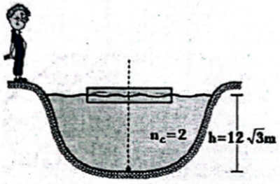 Uma pessoa parada na margem de uma lagoa não viu o feixe de luz proveniente de uma fonte que está o 12√3 m de profundidade devido a um disco de madeira localizado sobre a superfície. Calcule o raio mínimo (em m) do disco se o índice de refração do líquido na lagoa é 2.