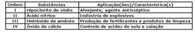 O quadro a seguir relaciona algumas substâncias químicas e sua(s) aplicação(ões) ou característica(s) frequentes no cotidiano.