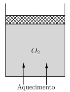 Na figura abaixo, um recipiente cilíndrico fechado por um pistão de massa 50 kg contém gás oxigênio. O pistão possui seção transversal de 100 cm², a mesma do cilindro, e desliza se atrito pelas suas paredes. A pressão atmosférica é 1 atm.