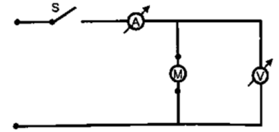 Com a chave S fechada, o amperímetro A indica a intensidade i da corrente elétrica que circula pelo circuito e o voltímetro V mede a ddp U' nos terminais do motor. Considera-se os fios de ligação com resistência desprezível e os aparelhos de medida como sendo ideais. No instante em que a chave S é aberta, a indicação no amperímetro e no voltímetro será, respectivamente.