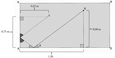 O retângulo PQRS é a representação de uma mesa de sinuca. O objetivo é alcançar a bola verde, representada pelo ponto V, com a bola branca, representada pelo ponto B. Sabe-se que o ângulo de incidência é igual ao ângulo de reflexão, como destacado na figura abaixo.