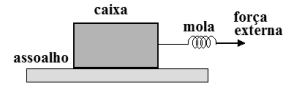 Na figura a seguir apresenta-se uma caixa de madeira de massa igual a 6,0 kg que está sobre um assoalho de madeira e é puxada por uma força externa paralela ao solo através de uma mola, até que entre em movimento e, em seguida mantenha-se em velocidade constante. A diferença entre o alongamento máximo da mola e o alongamento necessário para manter o movimento descrito é de _____ cm.