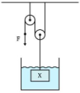 O sistema hidrostático ilustrado da figura é composto por duas polias e um reservatório de um líquido de densidade 𝝆. Sabendo que o bloco tem densidade 𝝁, determine o valor da força F para que o sistema permaneça em equilíbrio. Despreze qualquer atrito.