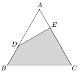 No triângulo equilátero ABC da figura, o segmento DA é o dobro de DB e o segmento EC é o dobro de EA. Sabendo que a área do triângulo ABC é igual a 162 cm², qual é a área, em cm² , do quadrilátero sombreado?