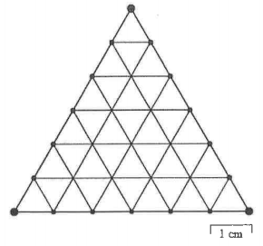 Um triângulo equilátero de lado 6 em é dividido em 36 triângulos idênticos, de lado 1 cm, conforme a figura abaixo.
