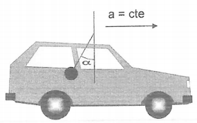 Um veículo movimenta-se em uma estrada reta e horizontal, com aceleração constante. Para determinar o módulo da aceleração do veículo, penduramos, em seu teto, um pêndulo, que fica inclinado de alfa graus em relação à vertical, como na figura abaixo;